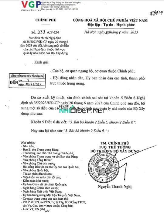 Nghị định 35/2023/NĐ-CP Sửa đổi bổ sung một số điều của các Nghị định thuộc lĩnh vực Xây dựng