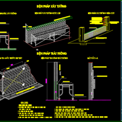 – Dọn dẹp mặt bằng (cỏ,cây và các vật dụng…) đóng lán trại để bỏ vật tư và công nhân nghỉ lại công trình,trường hợp nhà dân dụng hai bên là vách nhà thì sơn trục tim cột vào hai vách nhà mượn để làm chuẩn,trường hợp công trình rộng lớn hơn thì đóng gabarie để làm tim chuẩn cho bước cột.