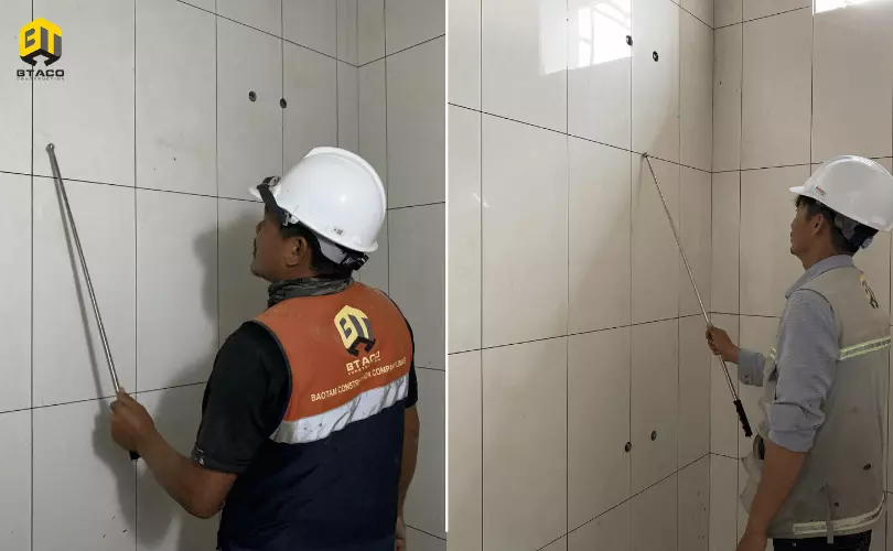Kiểm tra mặt phẳng của các viên gạch bằng thước nhôm. Chú ý gối cửa nằn trong nhà vệ sinh phải ốp gạch.( vách chia phòng bằng vách tường xây). Khi xong 1 vách hoặc dừng nghỉ thì phải dùng giẻ lau vệ sinh mặt gạch và ron gạch. Khi vệ sinh ron gạch thì phải móc sâu >= 3mm để sau trét ron đảm bảo không bị bong tróc.