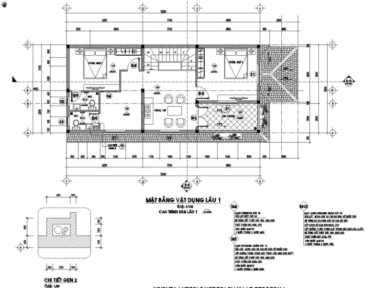 Tầng 2: P.Thờ, 2 ngủ ( 1 phòng khép kín có wc), 1 wc chung, sân thượng.